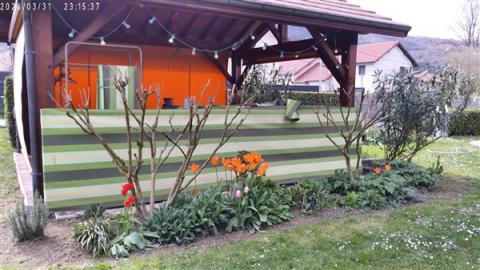 Et dans le jardin, il y a beaucoup de fleurs : des tulipes orange, blanches et roses, rouges et jaunes, des jonquilles, de la bruyère rose, des pensées violettes, des jacinthes violettes et blanches, de petites fleurs roses sur le grevillea, des hellébores roses.
