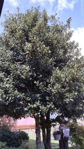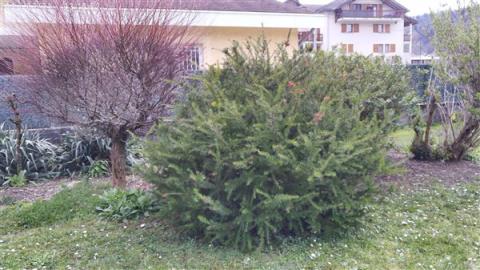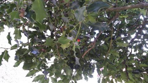 Le houx n'a plus beaucoup de boules rouges. Il nous semble que les feuilles du haut de l'arbre ont moins de piquants. L'arbre est plus touffu. Il y a quelques feuilles sèches et marron.