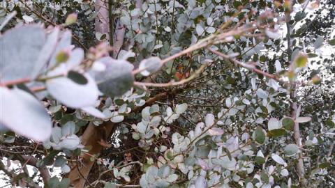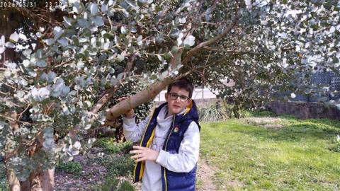L'eucalyptus a grandi et a plein de nouvelles petites feuilles. Sur certaines feuilles, il y a des petites tâches violettes. Mamie Dédée ne sait pas ce que c'est. Peut-être que c'est une maladie?